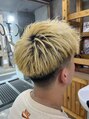 サイドはツーブロック、後ろは自然なグラデーションに刈り上げテーパーで攻めすぎないフェードスタイルに仕上げました。カラーは一回のブリーチで、ダメージを最小限に抑えてます。