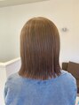ヘイリーボブ。ひろがりやすい髪に髪質改善をしてボリュームを抑えて、たっぷりとスジ感を入れました。肩にあたってはねやすくしてあります。