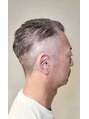 フェイドツーブロック。サイドからバックにかけ刈り上げ、ややツーブロックぎみにトップは短めに残す。イノアカラーで白髪ぼかしカラー。