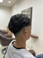 サイドがすっきりとフェードカットされ、トップのカールが特徴的で動きのあるデザイン。