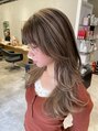 動きの出るレイヤーカットに、根本を暗めに残したシャドールーツをかけ合わせた、ナチュラルで上品な大人スタイル。カラーは透明感のあるベージュ系で、やわらかく女性らしい印象に仕上げました。