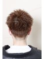 メンズのスパイキーショート顔の形、骨格に合わせたカットライン。モデルさんは面長なので横にボリュームが出るようカット、刈り上げも低め設定。スタイリング剤はグリースメインでタオルドライ状態からスタイリング。