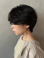 前下がりのセンターパートスタイル。前髪は少し長めに残してニュアンスパーマで毛流れを作ることで、ショートでも女性らしさの残るヘアスタイルに。ドライして、バームやオイルをつけるだけなので毎朝のスタイリングも簡単です。