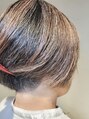 ディスコネクションボブ。バック内側は刈り上げ、毛量を少なくしたボブスタイル。イノアカラーと白髪ぼかしハイライトの組み合わせ。