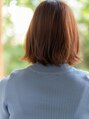 ボブスタイルの表面にレイヤーを入れています。毛先を外ハネにしてレイヤーをうちに入れることでひし形のシルエットができます。表面を少し引き出すことで緩い感じを出しています。前髪は程よい薄さにすることで重すぎない印象に仕上げています。