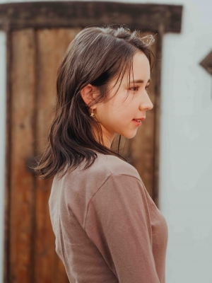 ゆるっとしたシルエットのカールで柔らかな女性らしい可愛いスタイルです。毛先を外ハネにして重たく見えないように巻きすぎない程度のカール感で動きを出しました。柔らかいベージュ系のカラーで透明感を再現しました。