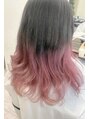 鎖骨くらいの長さのミディアムヘアで、毛先にかけてレイヤーが入ってますグラデーションカラーで根元付近から中間にかけては落ち着いたグレー系の色味で、そこから毛先にかけて鮮やかなピンクへチェンジ