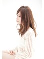 根元から緩めのパーマをかけてアンニュイな仕上がりに。前髪はおろし流しで、少し可愛く。目の上ギリギリの斜めバングで目元を印象付けます。小顔に見える髪型をご提案します◎