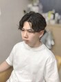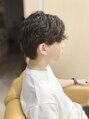 ゆるめのリバースパーマで自然な動きを出し、ドライヤーで前髪をセンターパートに整えます。柔らかめのワックスを全体に馴染ませて、束感と立体感を演出。清潔感とこなれ感が際立つスタイルです。