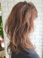 ロングウェーブ。くせ毛を活かしたウェーブスタイル。明るめのイノアカラーで軽さ強調。