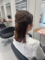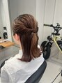 ボブヘアのお客様。表面はゆるっとたばねて、毛先は外ハネのシンプルハーフアップ