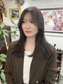 ロングのレイヤーなしスタイルです。カラーはベージュ系で7トーンくらいの明るさです。前髪はシースルーと分けるのをどちらもできるようになっています。