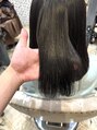 髪質改善ストレートです。髪質は硬く毛量もしっかりある方です。癖は普通より少しうねりが強いです。髪が太く量が多いことから膨らむこととダメージを気にされていましたので、髪質改善ストレートをさせていただきました。