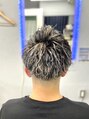 ホワイトメッシュにツイスパしてフェードでツーブロックしたスタイルになります。メッシュにパーマすると躍動感がて出てカッコいいです。