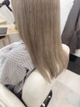 黄味を抑えた、くすみのあるグレージュカラー。やわらかな雰囲気で、光の加減によってシルバーのようにも見えて透明感があります。ブリーチを丁寧に重ね、こまめにブリーチのリタッチもしながらケアしていらっしゃる方のカラーリングです。