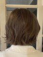 顎下ラインのショートボブスタイルに僅かにグラデーションを入れて動きと丸みをプラスしたヘアスタイル。ハイライトで伸びてきても馴染みやすく白髪もぼかしながらミルクティーグレージュカラーに。立体感、透明感、柔らかさが加わります。