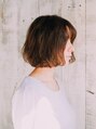 アゴラインのワンレングスボブがベース。トップから毛先にかけてゆるくくせ毛風なパーマをかけてやわらかな質感を出しています。前髪は目ギリギリなシースルーバングで抜け感をだすことで重たくなりすぎないようにしています☆