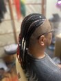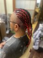 アシンメトリーのコーンロウスタイルです。ラスタ/レッド/クロスを、編まさせていただきました。地毛スタイルよりも、お気軽にカラーを入れれるところが、エクステンションの魅力でもあります!通年、クーポン付きの定番メニューです。