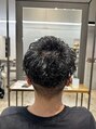 フロントを立ち上げたアップバングと、しっかりかけたスパイラル寄りのパーマが印象的なスタイル◎ウェット系スタイリング剤でツヤを出し、ラフさの中に清潔感をプラスしています◎サイド~バックは短めの刈り上げで引き締め、男らしさとメリハリを演出◎