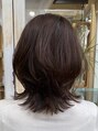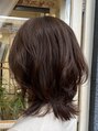 鎖骨レングスのロングボブ(ロブ)で自然に外ハネになるレングスに。厚みのバランスをみながらレイヤーを中間から表面にかけていれて、くびれて頭の形を綺麗に見せるシルエットに。顔まわりと表面を32mmのコテでワンカールするだけで決まる簡単スタイリング。