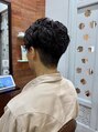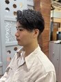 夏に向けてアップバングで爽やかなショートヘア。ベースはツーブロックのサイドパートショート。パーマは前髪を上げやすくして、後ろに流れるようにかけてます。カジュアルにも!ビジネスにも!