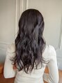 顔回りに動きが出るように少しレイヤーを入れてるロングヘアスタイルになります。前髪を薄バングにすることで全体的に軽さのある印象に。ヘアカラーはダークカラーで艶感と落ち着いた雰囲気がでて大人っぽいイメージに