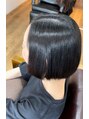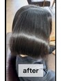 新しく伸びてきた根元部分にのみ矯正(リタッチ)を施術しました。すでに矯正がかかっている毛先部分は薬剤をつけず特殊なトリートメントで保護、負担を最小限に抑えながら、栄養補給のトリートメントのみでケアしていますので、よりツヤ感と柔らかさが出ます