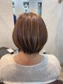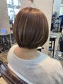 ハイライトとくびれボブを合わせたスタイルになります。カラーは細かめのハイライトで動きも出て束感もアップ!透明感の出やすいミルクティー系のお色になりますスタイリング剤はバーム系などでセットすると束感で出て◎