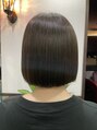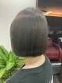 赤みの少ないオリーブブラウンと切りっぱなしボブの組み合わせ。8トーンくらいを目指していくと色味も感じ、質感も重くなくおススメ。アイロンは120-140度で通してあげると退色も少ない◎梅雨時期もOK◎