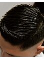 サイドの張りが強く出る骨格と毛質なのでハイフェードに設定。力強い毛流はセニングを入れずに面を意識したカットラインになっています。スタイリングは艶強めのハードなグリースをしっかり撫でつけコーミング。