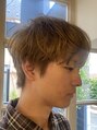 マッシュベースの髪型に、耳周り襟足は、ソフトに2ブロックですっきりと。カラーリングは全体的にブリーチし、ミルクティーブロンドで透明感と抜け感をプラス。