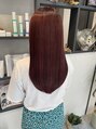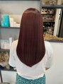 艶感たっぷりのボルドーカラーで大人可愛い印象に仕上げたストレートロングスタイル。毛先にかけて自然な丸みをつけることで、女性らしい柔らかさを演出しています。カラーは深みのあるレッド系で、肌の透明感もアップ。