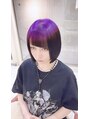 ベースは内側を刈り上げ、前髪は斜めにパッツンカットした個性派ボブに、ブリーチオンカラーでパープル×ブラックのルーツカラーデザイン☆カラーもデザインも個性的で派手可愛い☆