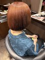 ショートボブのヘアスタイルで、鮮やかなオレンジブラウンのカラーが特徴です。まとまりが良く、ナチュラルなツヤ感があります。