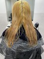 暗染め履歴からのグレージュカラー。前回のカラーで暗染めの残留色素が中間に残っているので、今回のブリーチでは無理をせずに優しく残留を取るだけにして次回のブリーチに繋げます。