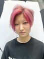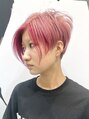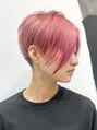 長短をしっかりつけた前下がりにトップにハイレイヤーをいれた立体感のあるショートヘア。カラーリングでも同色ピンクのグラデーションカラーで奥行きを出しています。