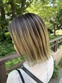 中間から毛先にかけて、ケアブリーチをして、全体に薄めのグリーンでライム寄りのグリーンを◯カットは切りっぱなしなので、ストレートアイロンなどで、毛先を軽く外ハネにしてオイルをサラッとつけるだけでOKなスタイルです!
