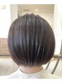 襟足短めのショートボブ。7トーンモカグレージュカラーで落ち着いた仕上がりに。毛先は柔らかい質感に。時短ドライでおさまりよく。