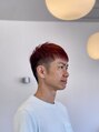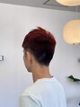 ツーブロックマッシュ。刈り上げラインを高めに設定して、トップを丸くカット。トップを軽くブリーチをし、その下も時間差でブリーチをして、明るさをグラデーションの状態にしてからインペリアルレッドで染めました。イベントに参加のためしっかり染めました