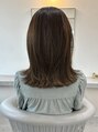 切りっぱなしのセミロングスタイル。ぱつんとしたライン感と外ハネがカジュアルな親しみやすさをアップします。カラーは透け感と深みのある寒色系のカーキに。面を出してツヤツヤに仕上げます。