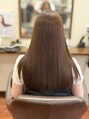 外の光に当たるとミルクティー色に見える人気色♪シャンプーでは取り除けない薬剤除去も一緒にするとカラー後のごわつき感がなく仕上がります。