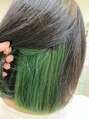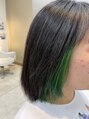 ミディアムボブのインナーカラー。ハーフアップにも1本で結べる事も出来る長さです。おろしていてもサイドからチラリと見えるインナーカラーを入れています。暑い季節にもピッタリのヘアスタイルで、おススメです。
