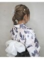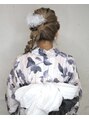 浴衣とヘアセット。浴衣に編み下ろしの組み合わせは、品よく大人っぽい印象です。髪飾りも全体のバランスを確認しつつ、お写真を撮るときに映えるように配置します。