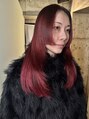 guest hair.元々全頭ブリーチなのを、ハイライトリタッチで繋げて、その後からチェリーレッドを重ねています。顔周りは姫カット風にステップカット。その下はシャギーレイヤーで繋げています。モードなデザインが好きな方にオススメです。