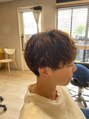 襟足とサイドはすっきりと刈り上げ、全体はマッシュベースで丸みを残しながらも、動きのあるパーマで軽やかな印象