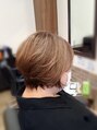 スッキリ!ショートレイヤー脱白髪染めハイライトで、明るめおしゃれカラー!お仕上げにアイロンで毛先を巻くと、動きのある可愛い印象に♪