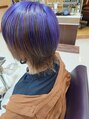ハイトーンカラーに紫のアンブレラカラーで、個性あるスタイルに仕上がりました!トリートメントもさせて頂いており仕上がりもサラサラです。ブリーチ、ダブルカラー等予約は電話でお問い合わせ下さい。