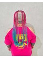 スキンフェードに刈り上げて、前髪以外にグラデションカラーの特殊エクステを編み込みブレイズ編み、毛先ゴム縛りヘアジュエリーカラフルドレッドロックスジュエリー装着。派手髪ブレイズ/前髪ありブレイズ/ピンクカラー/オン眉/派手髪関西兵庫県姫路