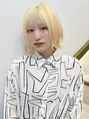 ブロンドのフェイスレイヤーボブ。ブリーチ2、3回して、パープルホワイトでオンカラー。カットは顔まわりを包むようにレイヤーを入れて、スタイリングは、外ハネ・顔周りは内側に入れて完成