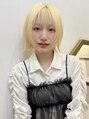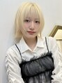 ブロンドのフェイスレイヤーボブ。ブリーチ2、3回して、パープルホワイトでオンカラー。カットは顔まわりを包むようにレイヤーを入れて、スタイリングは、外ハネ・顔周りは内側に入れて完成